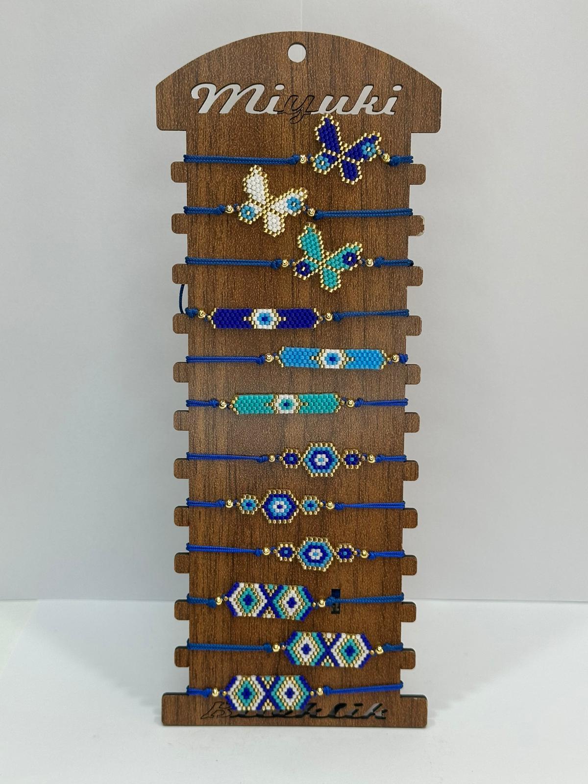 El yapımı ve özel tasarım Nazar Figüratif miyuki bilekliklerimiz, 12’li ahşap stant ile toptan satışta sizlerle.