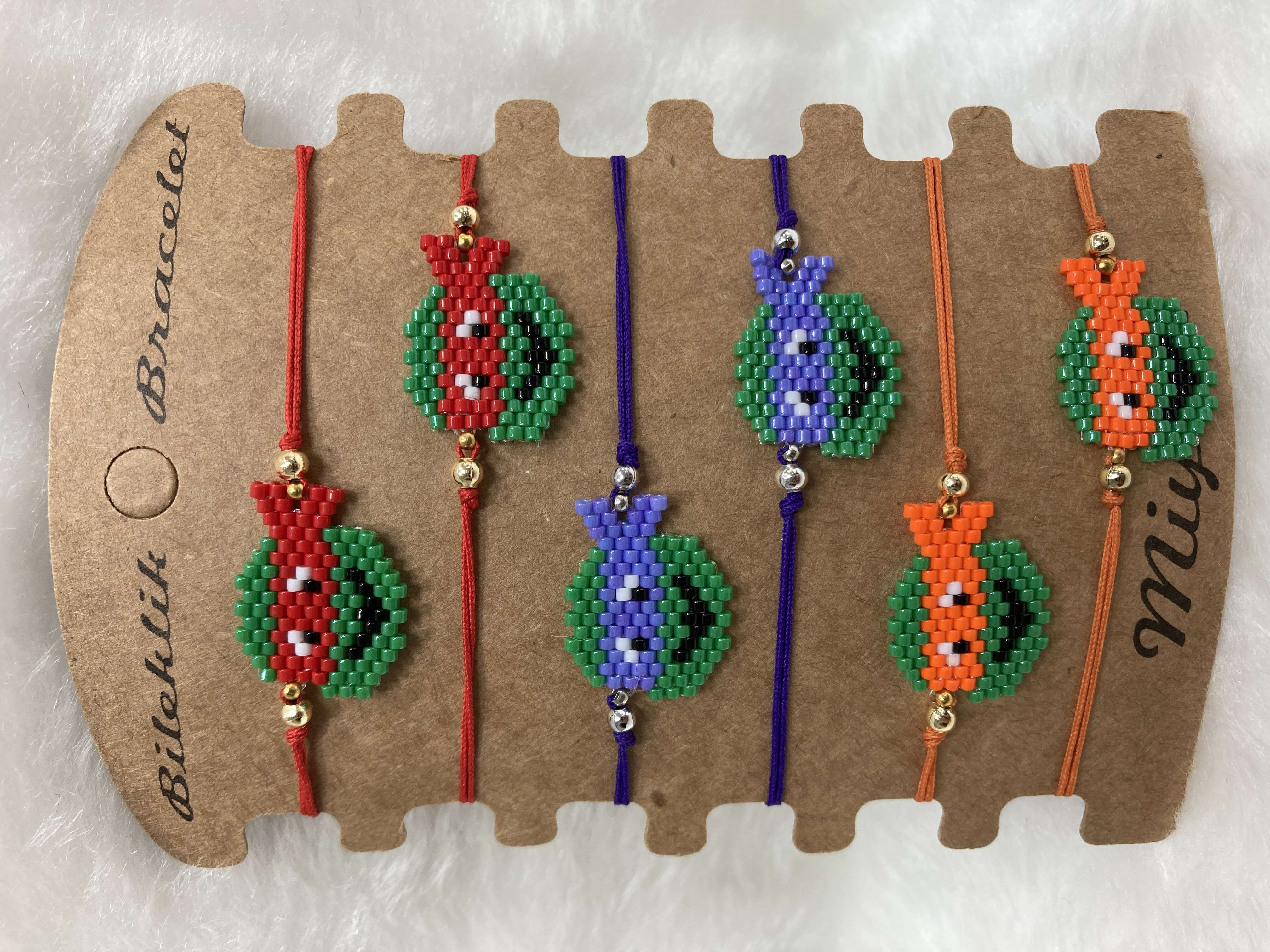 KDV Sepette Hesaplanır.El yapımı ve özel tasarım Ninja Kaplumbağalar miyuki çocuk bilekliklerimiz, 6’lı kraft kart ile toptan satışta sizlerle.