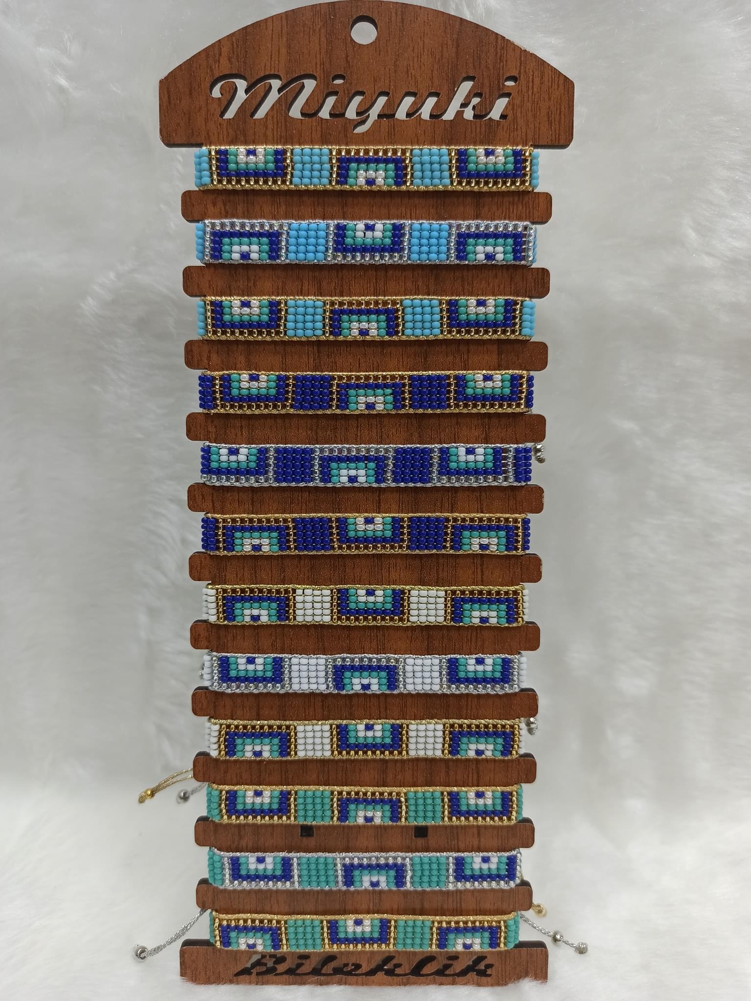 El emeği ile hazırlanan 5 Sıra nazar Tasarım miyuki bileklikler, zarif tasarımlarıyla şıklığı ve doğallığı bir araya getiriyor. Ayarlanabilir asansörlü yapısı sayesinde her bileğe uyum sağlar. Ürünler, özel ahşap stant üzerinde düzenli şekilde sunulmaktadır.