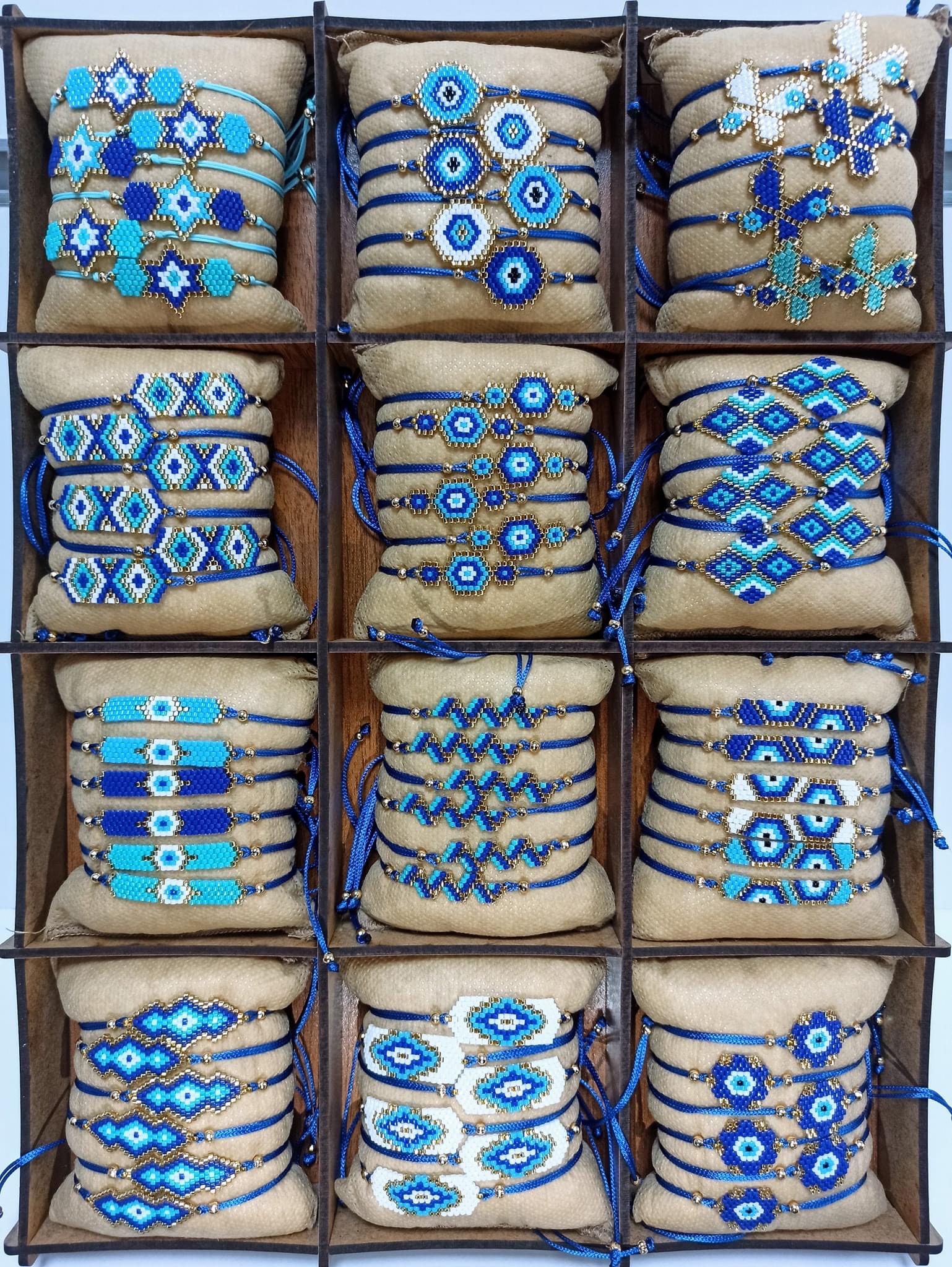 El yapımı ve özel tasarım Toptan Miyuki Nazar Bileklik – Mavi Tılsım Serisi bilekliklerimiz, 72’li ahşap stant ile toptan satışta sizlerle.