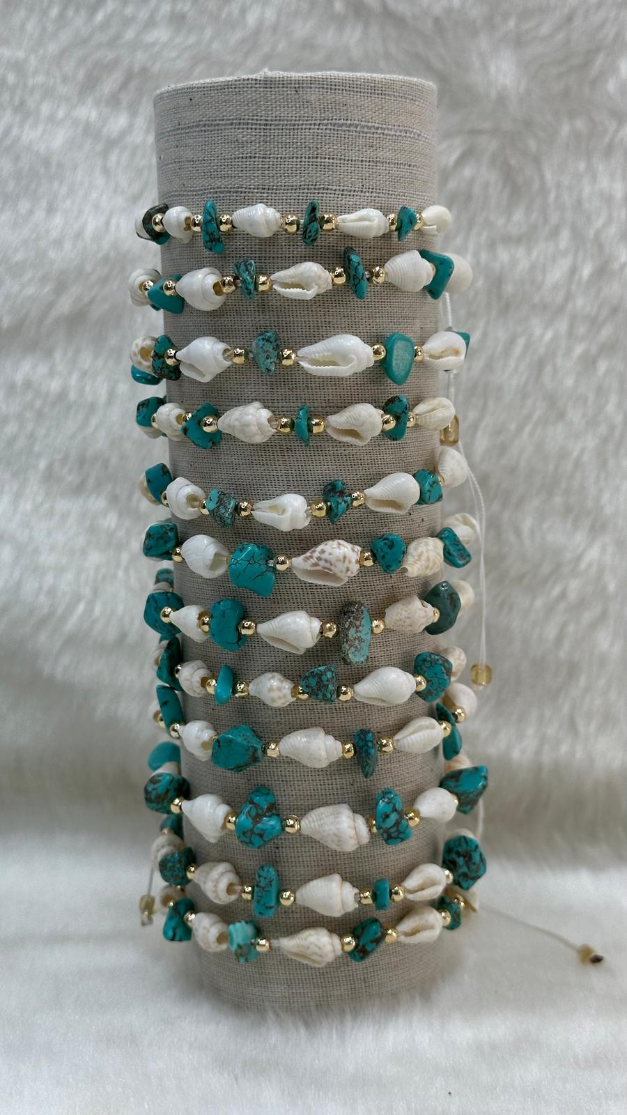 KDV Sepette Hesaplanır.El yapımı ve özel tasarım Turkuaz Doğal Taş Deniz Kabuğu halhal ve bileklikler, 12'li silindir stand ile toptan satışta sizlerle.